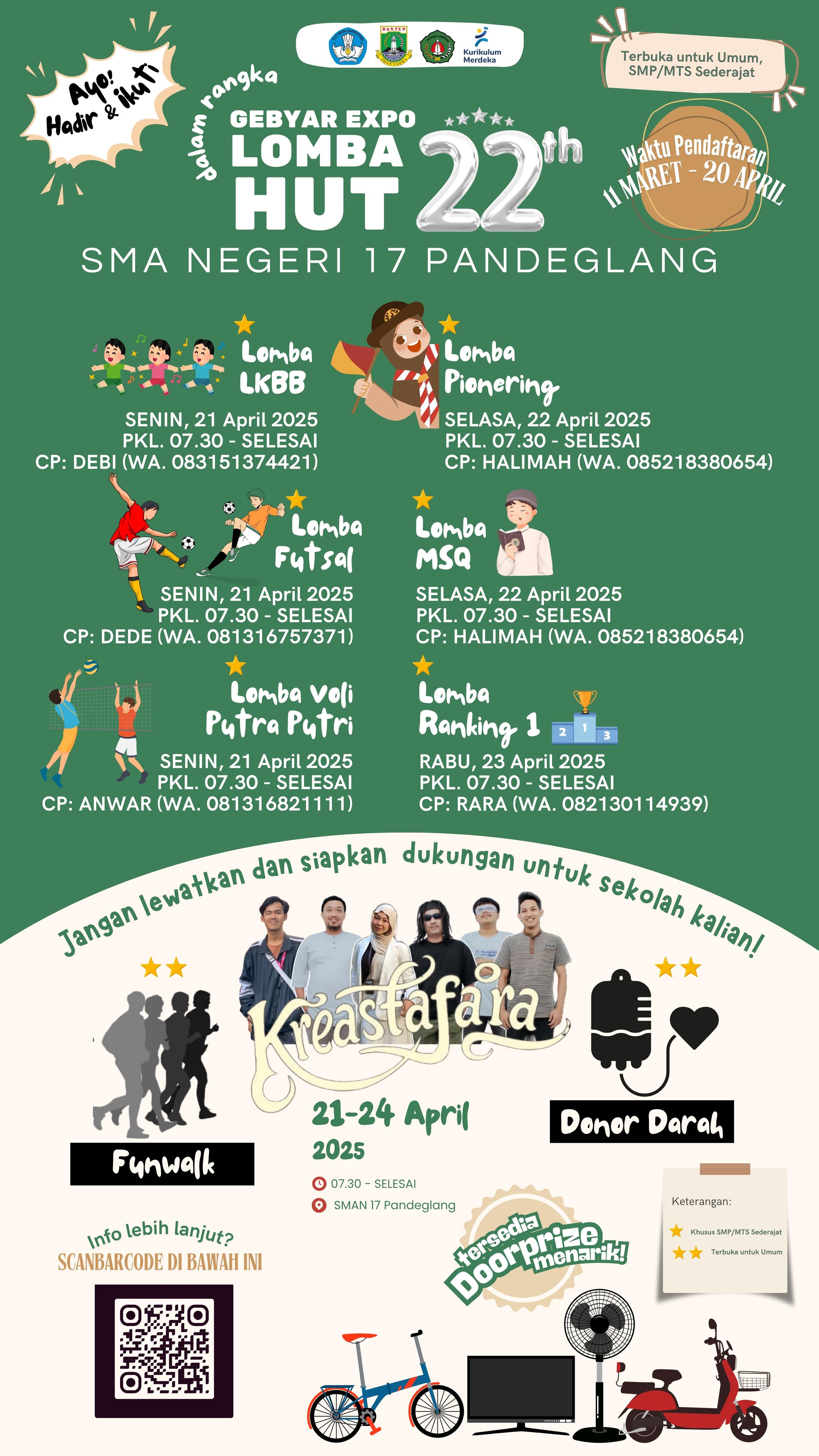 Dalam rangka memperingati Hari Ulang Tahun yang ke-22, SMA Negeri 17 Pandeglang mengundang seluruh siswa-siswi tingkat SMP/MTs untuk berpartisipasi dalam Gebyar Expo & Lomba HUT ke-22 yang penuh semangat, kreativitas, dan sportivitas!